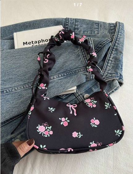 Shein 1pc Black Nylon Floral Print Zipper Closure Fashionable Casual Shoulder Bag +