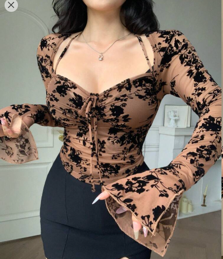 DAZY 1pc Women 2 In 1 Drawstring Tie Camisole Vacation Fitted Flocked All-Over Botanical Print Sheer Mesh Long Sleeve T-Shirt,Fall Women Clothes
