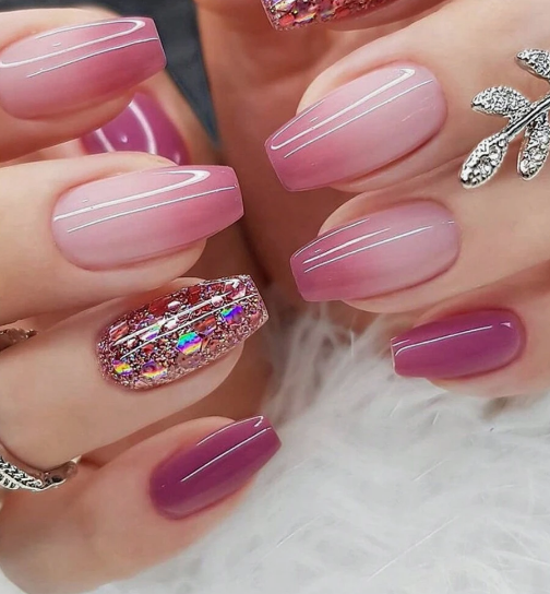 Upgrade Your Look With 24pcs Medium Length Almond Shaped Stylish Pink & Purple Ombre Glitter Shiny And Glossy Fully Covered Manicure Set, Perfect For Parties, Dances And Daily Wear Press On Nails Nail Supplies