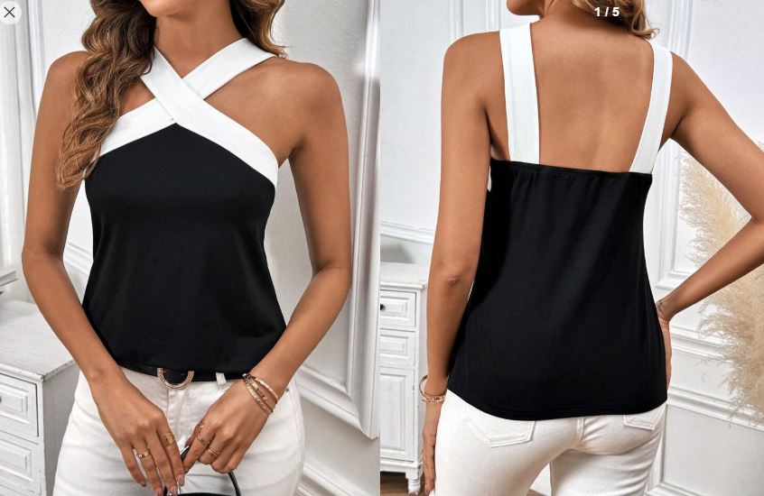 SHEIN Clasi Women Summer Black And White Splicing Casual Loose Halter Tank Top Halter Top.