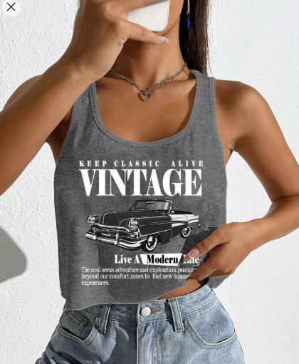 SHEIN EZwear Women's Casual Retro Car Graphic Oversized U-Neck Cropped Vest, Suitable For Summer Back To School