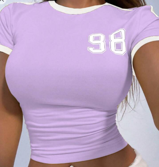 StreetHx Contrast Trim Round Neck Number & Letter Print Slim Fit Short Sleeve T-Shirt Graphic Tees Women Tops