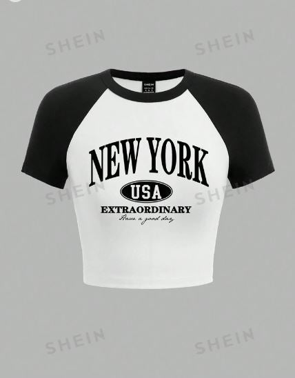 SHEIN EZwear Leisure Slim Fit Women Letter Printed Colorblock Cropped Top NEW YORK USA EXTRAORDINARY Have A Good Day