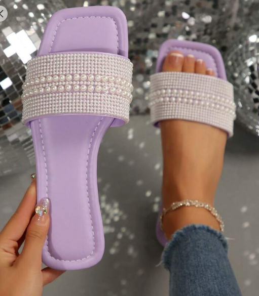 Plus Size Luxury Anti-Slip Square-Toe Rhinestone & Pearl Fashion Versatile Beach Holiday Purple Women Slides Sandals Valentines