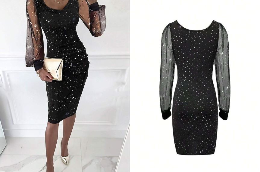 Shein Party Glitter Knitted See-Through Long Sleeve Patchwork Hooded Bodycon Mid-Length Dress, L /