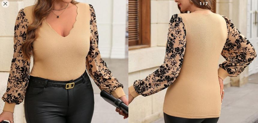 Shein Plus Contrast Mesh Scallop Trim Lantern Sleeve Top +