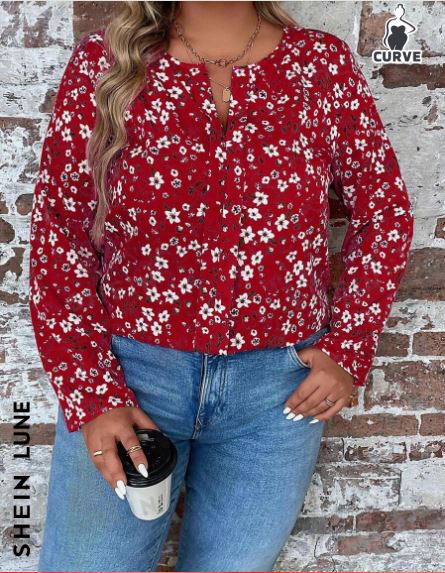 SHEIN LUNE Plus Ditsy Floral Print Notched Neck Blouse.