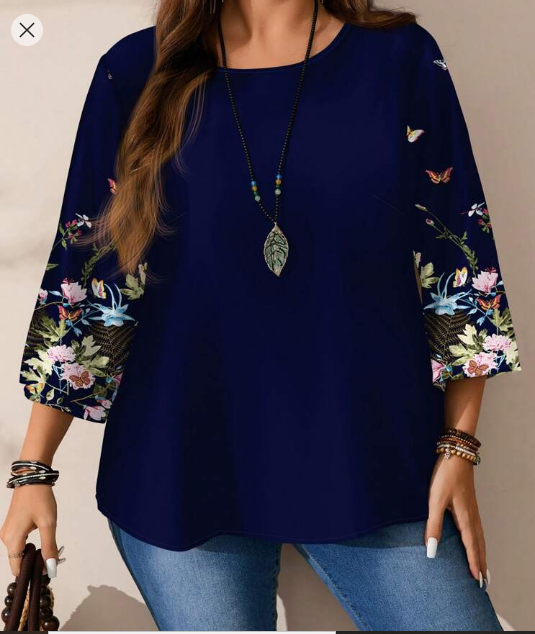 Shein Plus Size Casual Allover Print Round Neck Loose 3/4 Sleeve Blouse +