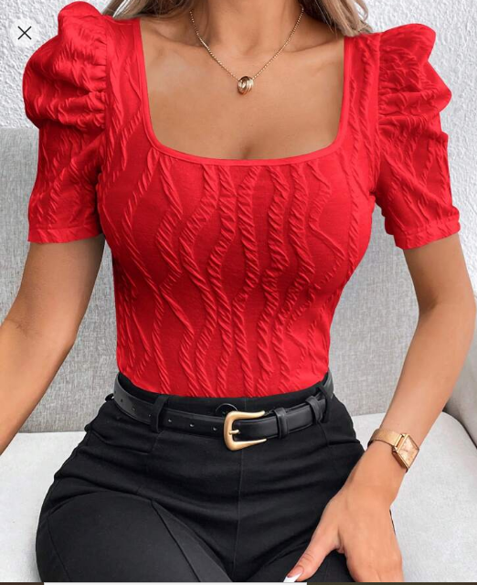 SHEIN Privé Square Neck Puff Sleeve Red Tee