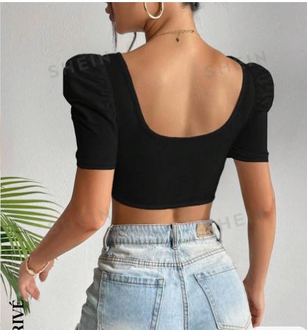Shein Square Neck Puff Sleeve Asymmetrical Hem Crop Tee +
