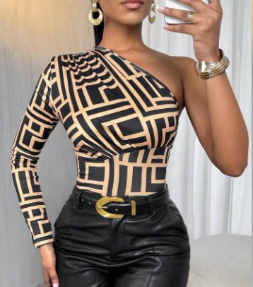 VaVaBold Women Crinkle All-Over Print Slanted Shoulder Long Sleeve Top, Casual Everyday Wear