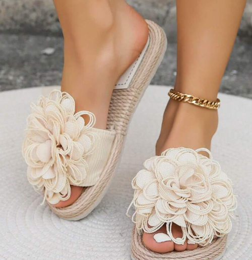 Shein Women Fashion Flat Beige Flowers Slip On Slides Sandals +