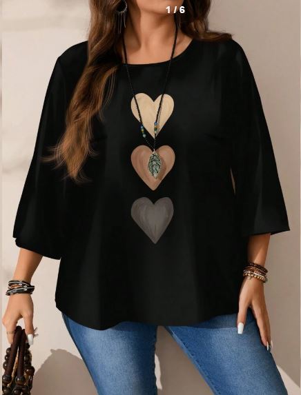 EMERY ROSE Plus Size Women's Casual Full Print Round Neck Loose 3/4 Sleeve Blouse, Autumn/Winter