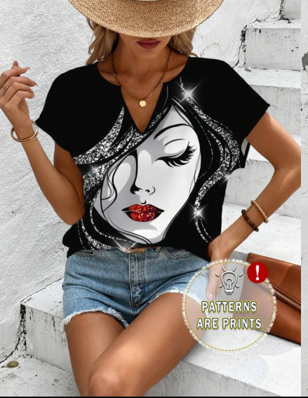 SHEIN LUNE Women's Casual Portrait Pattern Short Sleeve Blouse, Suitable For Summer Suitable For Going Out Chic Blouses For Women