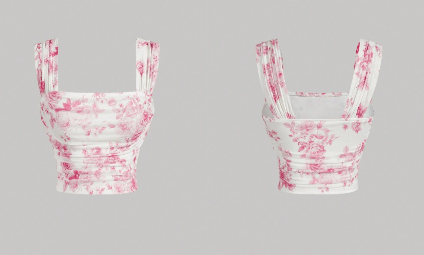 SHEIN MOD Women's Square Neck Fuchsine And White Floral Print Slim Fit Pleated Elegant Charm Tank Top,Fall Clothes,Halloween Clothes,Renaissance Top,Renaissance Fair