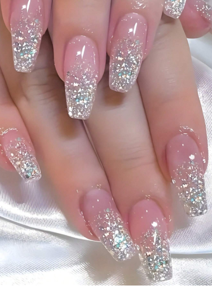 Y2k 24pcs Long Coffin Shape Pink & Silver Glitter Gradient False Nails, Sweet, Elegant And Cute Style, Removable Fake Nails With Adhesive & Nail File Kit, Suitable For Festival, Party, Dating And Daily Use, Comes With 24pcs Jelly Glue And Nail File Press On Nails Nail Supplies