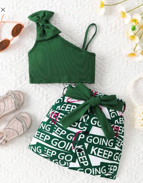 Shein Young Girl Bow Front Asymmetrical Neck Top & Letter Graphic Belted Skirt +