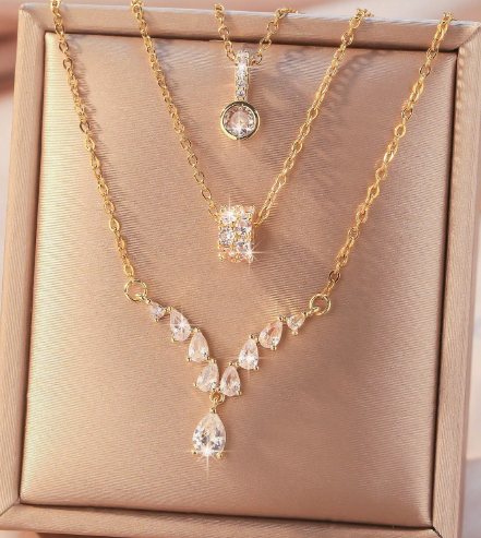 Hihho 3pcs Elegant & Fashionable Set: 3D Round, V-Shape Teardrop Pendant Necklaces With Cubic Zirconia, Luxury Jewelry Gift For Women And Festive Occasions