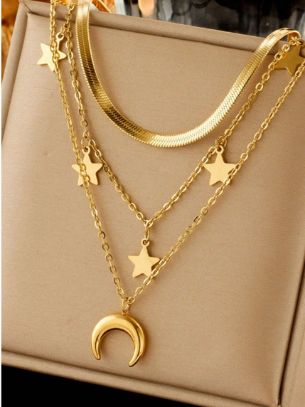 Shein One Three-Layer Stainless Steel Necklace With Star & Moon Pendant +