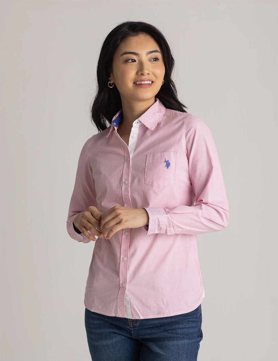 The Striped Poplin Long‑Sleeve Shirt from U.S. Polo Assn. offers crisp tailoring and versatile elegance ideal for both casual and semi‑formal settings. Made from lightweight cotton poplin, it features a classic stripe pattern, button-down collar, placket front, and full-length cuffed sleeves. Finished with a subtle embroidered U.S. Polo Assn. logo at the chest, this shirt delivers timeless appeal and everyday sophistication. Model wearing a size small